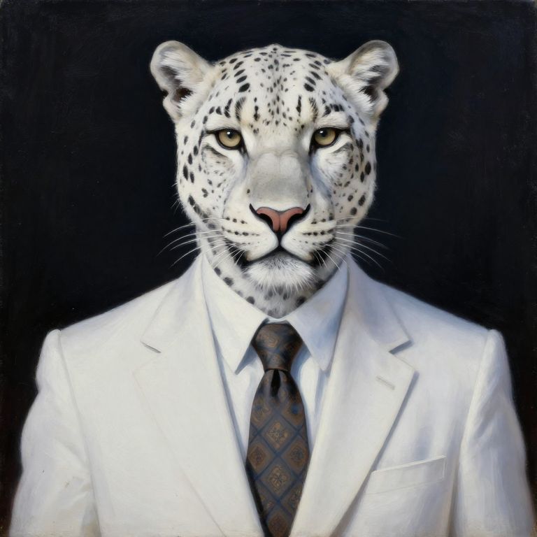 A surreal oil painting portrait of a white leopard in a white suit with a patterned tie, set against a dark background.