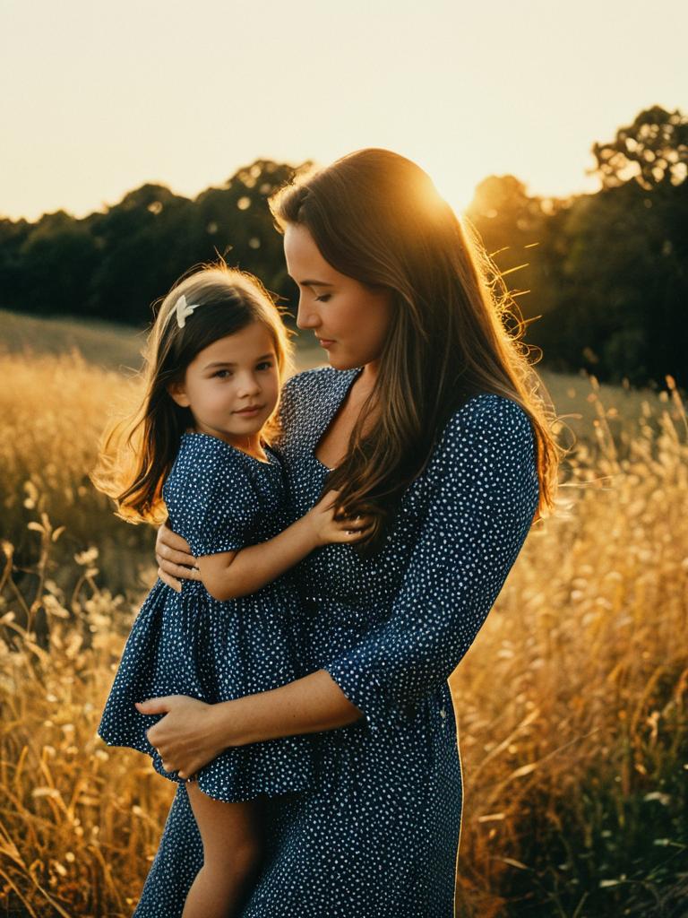 Woman with Daughter in Matching Outfit, photorealistic outdoor portrait at golden hour