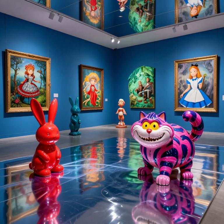 The image presents a surreal, hyperrealistic art exhibition in a contemporary museum, captured through a wide-angle lens. The scene is bathed in a vibrant, never-before-seen color palette, blending shades of blue, red, and green with a striking luminosity. The exhibition features a large, reverse reflective plastic setting, creating an illusion of depth and transparency. Among the exhibits, there are strikingly detailed, rubber latex bunnies and a colorful acrylic Cheshire cat, both exuding a sense of otherworldly charm. The setting is adorned with intricate, hyperrealistic sculptures and paintings, including a striking depiction of Alice in Wonderland, rendered in a style reminiscent of Jheronimus Bosch. The overall composition is a mind-blowing perspective, with shadows and light playing across the reflective surfaces, enhancing the surreal atmosphere. The image is a testament to the power of hyperrealism, capturing the essence of the exhibition with an unprecedented level of detail and intricacy.