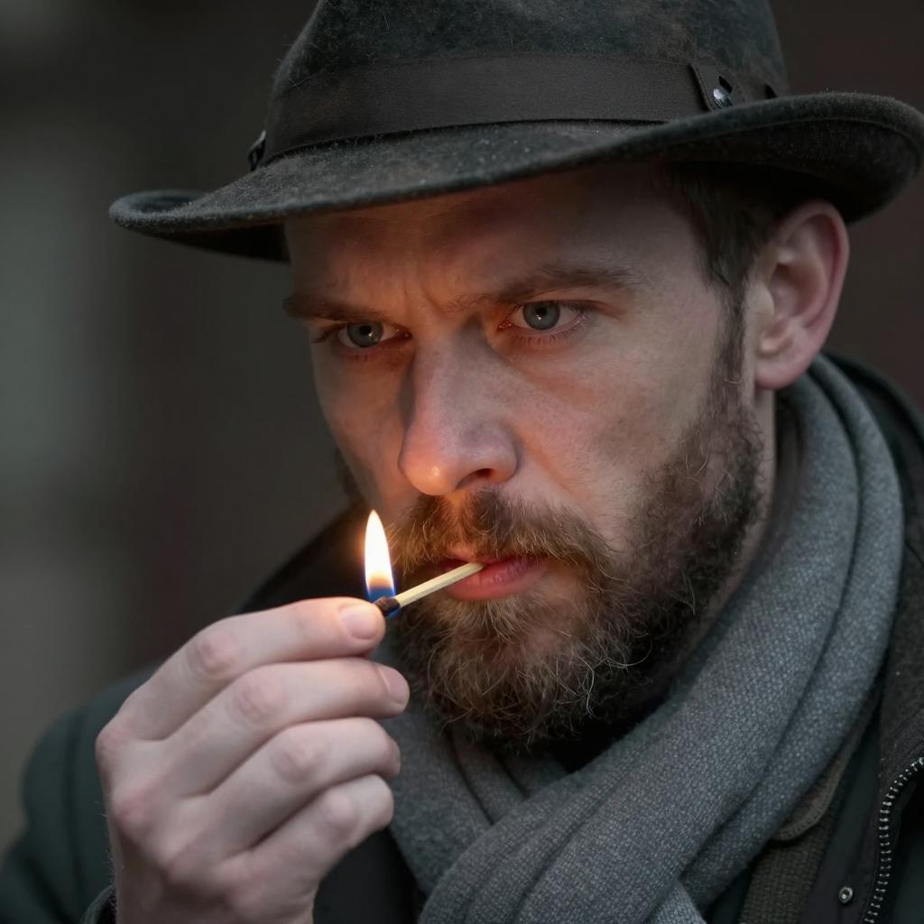 Close-up portrait of a bearded man with fair skin and blue eyes wearing a dark brown felt hat and gray scarf. He is holding a lit match close to his lips with his right hand. The background is dark and blurred, emphasizing the intense facial expression and the bright flame of the match.