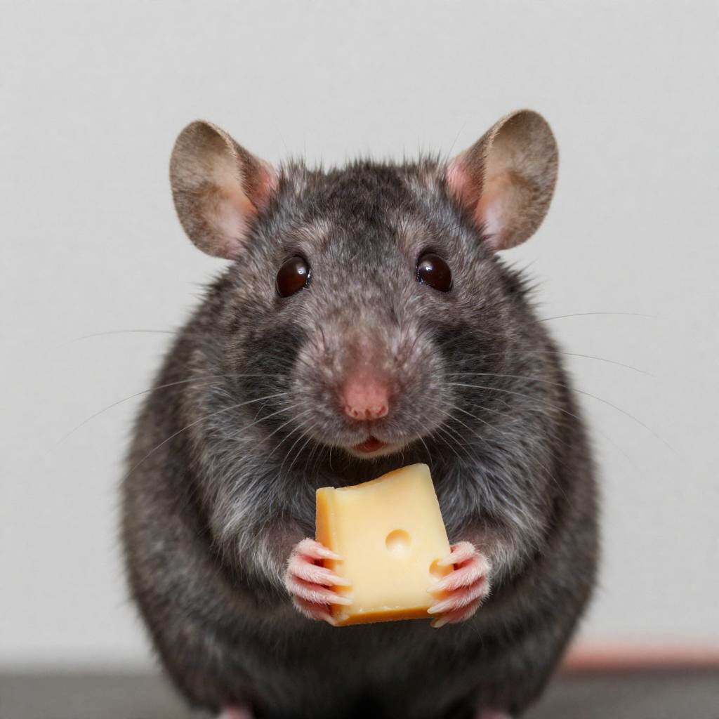 Upper body, solo, small mouse with soft grey fur, delicate pink ears and long whiskers, holding cheese, looking at viewer, warm chestnut-brown eyes, closed mouth, straight-on, simple background