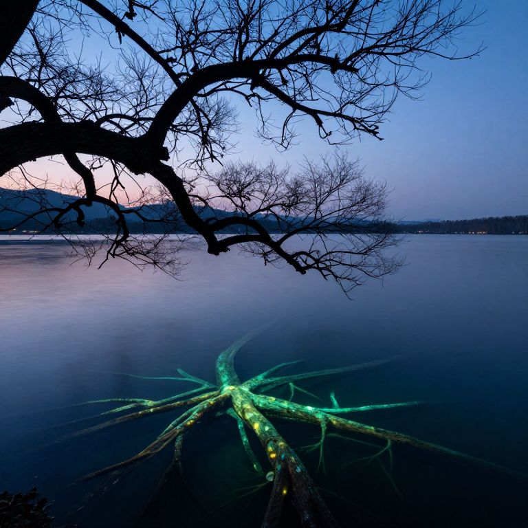 Silhouetted branches of a gnarled tree extend above a tranquil lake, while its submerged roots glow with bioluminescent lights, creating a mesmerizing underwater spectacle against the twilight sky.