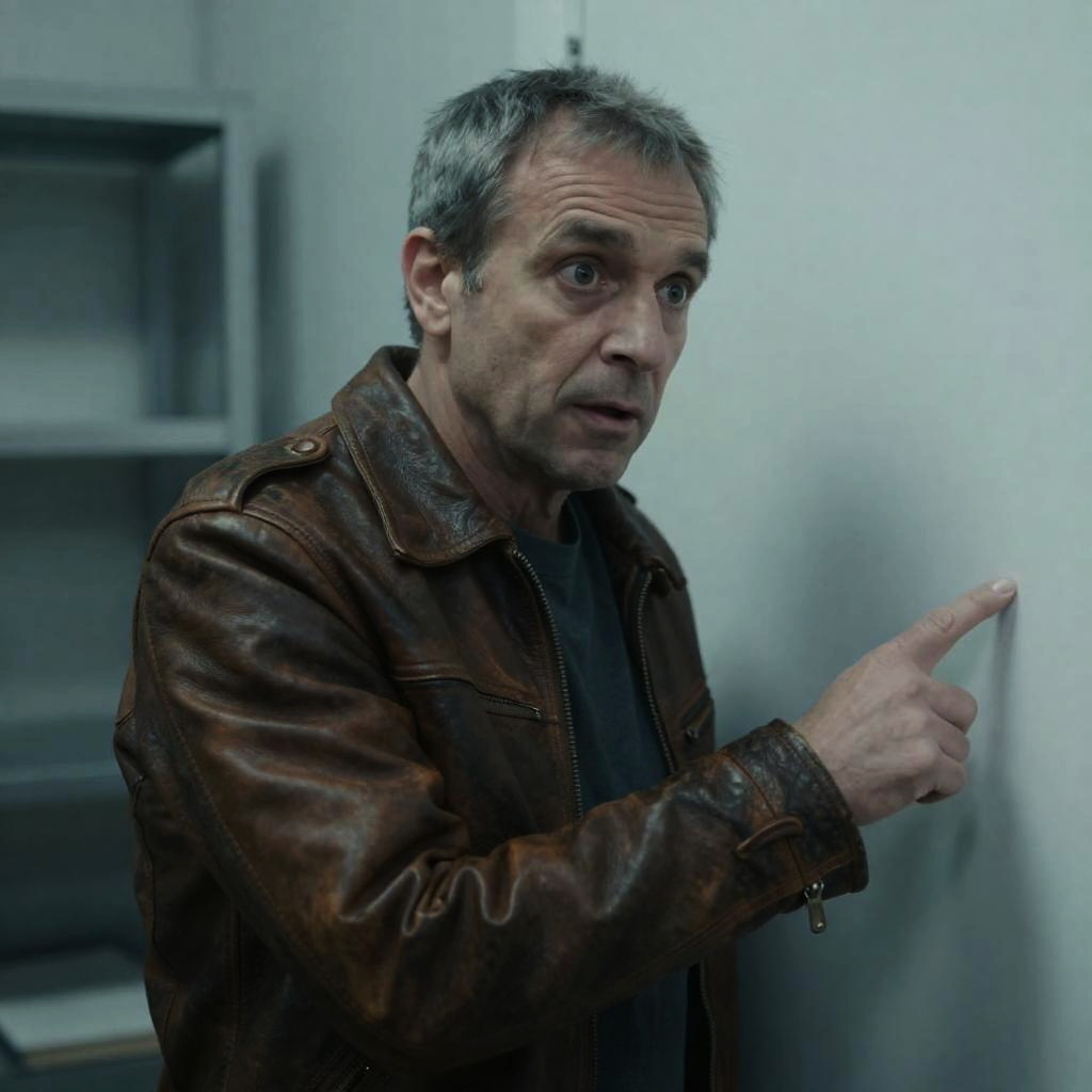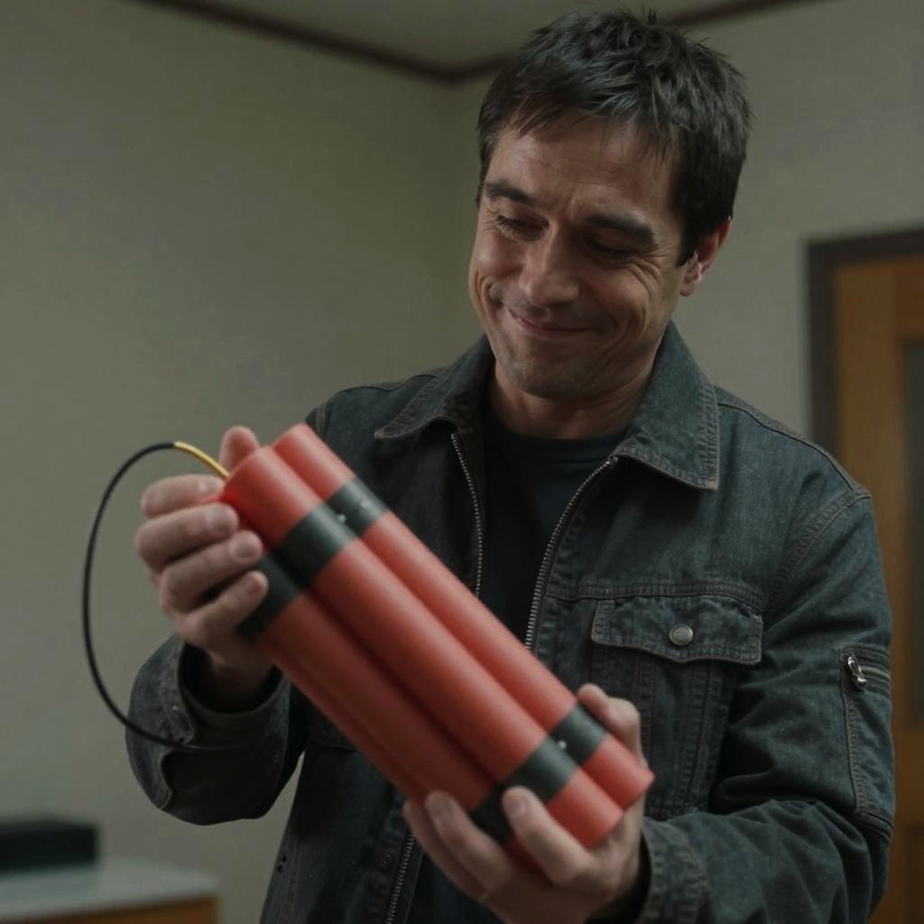 A tense, cinematic film still of a mad bomber planting an explosive device, their expression a twisted blend of avarice and unsettling calm as they meticulously carry out their destructive plan.