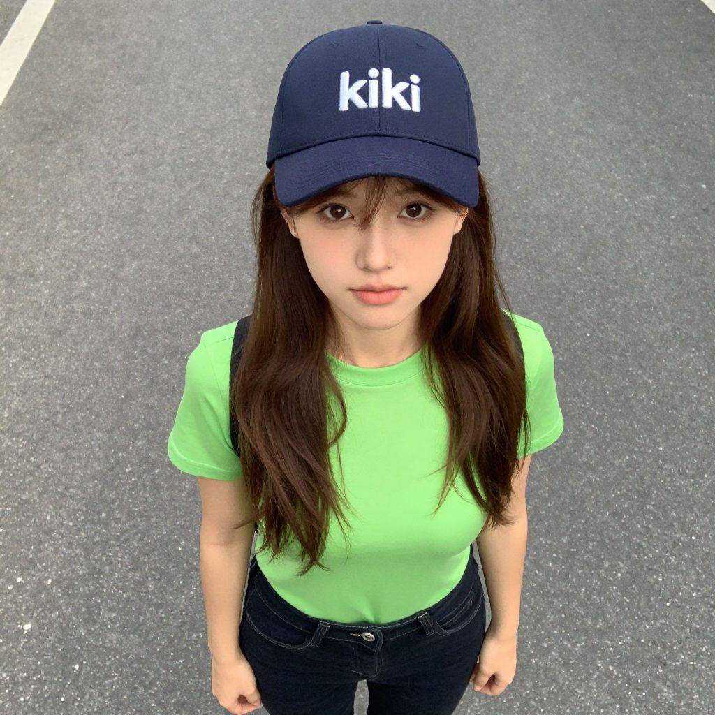 This is a digital, realistic-style photograph of an East Asian woman with long, straight, dark brown hair and fair skin. She is standing on an asphalt surface, looking directly at the camera with a neutral expression. She wears a dark blue baseball cap with the white logo "kiki" on the front, a bright green short-sleeved t-shirt, and dark blue high-waisted jeans. Her hands are by her sides, and the background is a plain, gray asphalt road with a white line on the upper left. The lighting is even, highlighting her youthful appearance and casual outfit.