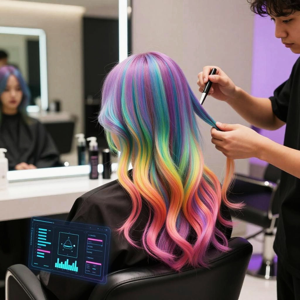 Futuristic depiction of AI to change hair color technology applied in a beauty salon, showing a client’s hair transitioning through a spectrum of neon shades under ambient lighting, with digital UI overlays and a modern, stylish atmosphere.