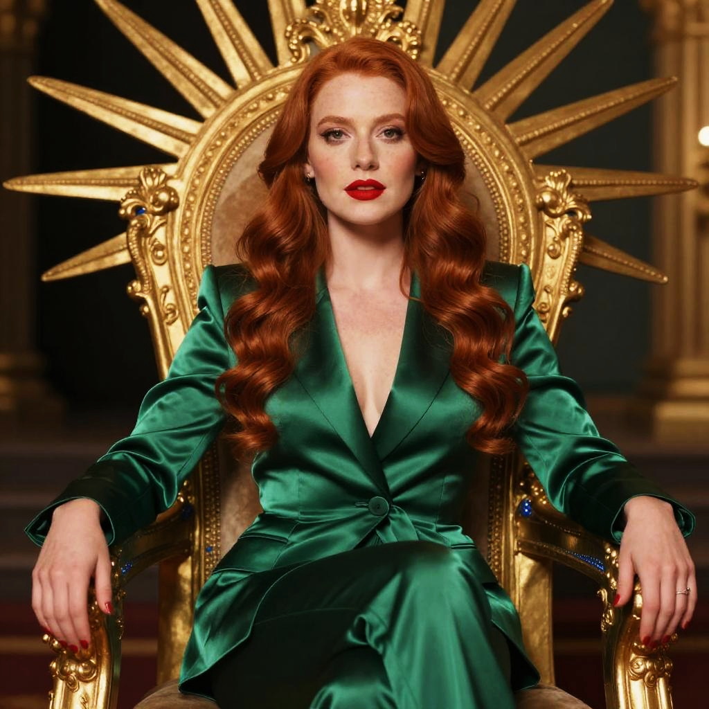 Photograph of a fair-skinned woman with long, wavy red hair sitting on a golden throne with a sunburst design. She's wearing a shiny, deep green, satin suit with a low V-neck, and she has red lipstick. Her arms rest on the throne's ornate, gold and blue armrests. The background is dark and blurred, focusing attention on her and the throne.