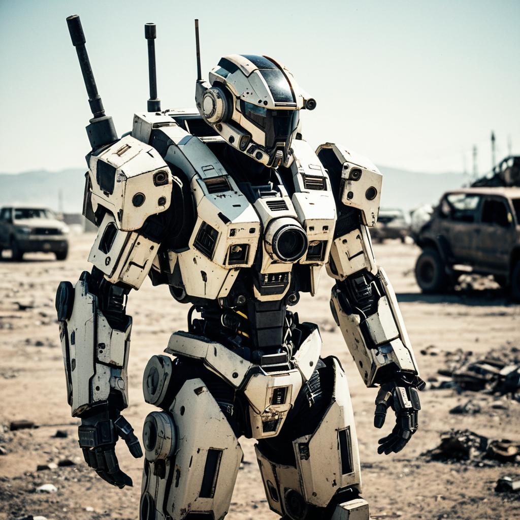 High-detail sci-fi android mech standing in a deserted post-apocalyptic wasteland with damaged vehicles in the background. The robot features white and black battle-worn armor, a sleek helmet with a visor, and multiple antennas on its back. The scene conveys a futuristic dystopian environment.