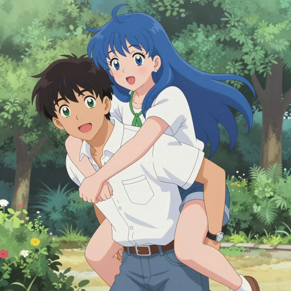 Digital anime-style illustration of a young couple in formal wear. The male character has brown dreadlocked hair, stubble, and brown eyes, wearing a black jacket over a white collared shirt and black tie. The female character has long brown hair with bangs and brown eyes, dressed in a white shirt with a black ribbon tie and a black jacket draped over her shoulders. The background is dark, highlighting the detailed character expressions and attire.