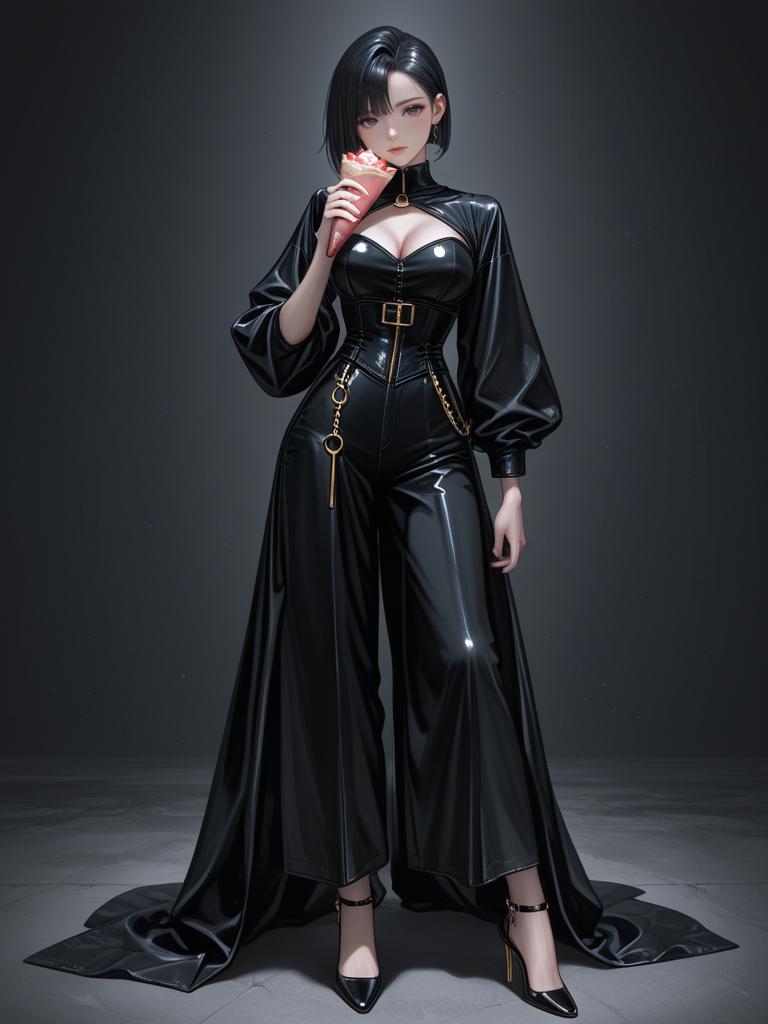 1girl, realistic face, Cut-Out Fashion Jumpsuit, sleek black fabric, high neckline, side cut-outs, fitted bodice, wide-leg trousers, lightweight crepe material, subtle sheen, gold zipper detail, minimalist aesthetic, paired with strappy stiletto heels, matching black clutch.