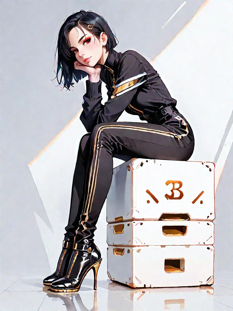 Stylish young woman with short dark hair sitting on white storage boxes, wearing a sleek black cut-out jumpsuit with gold zipper accents and fitted design. She pairs the outfit with black patent leather stiletto heels featuring gold accents, showcasing a modern minimalist fashion look. The scene is set against a neutral light background with reflective flooring.