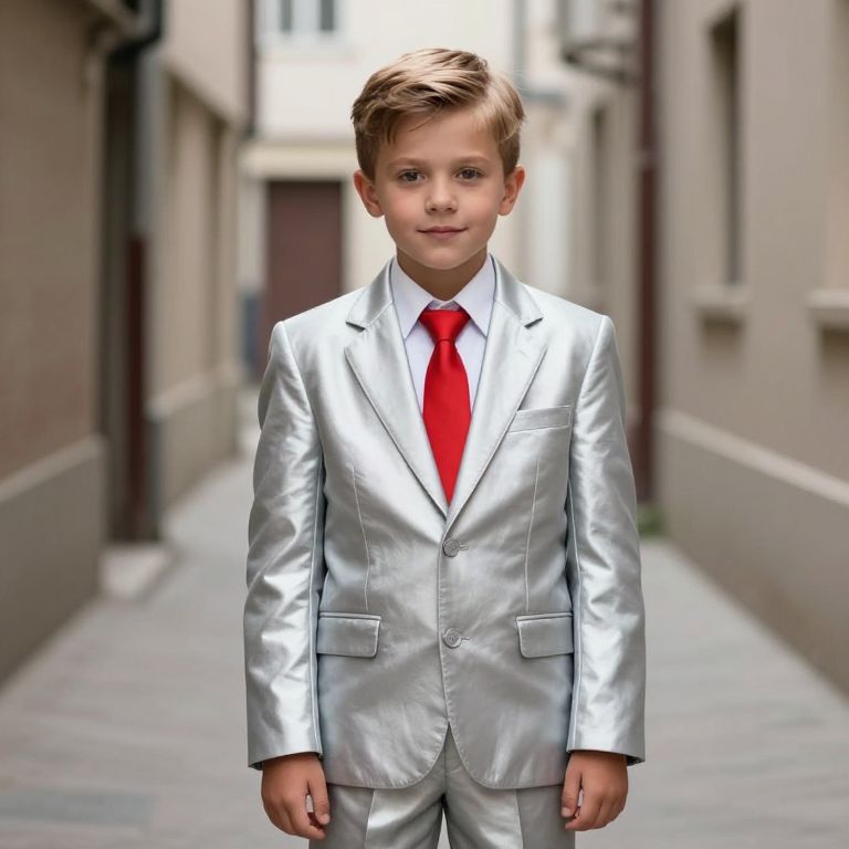 Photograph of a young boy standing in a narrow alleyway. He has light brown hair, fair skin, and is wearing a shiny, silver suit with a white dress shirt and a bright red tie. The alleyway features beige and gray buildings with windows and doors visible in the blurred background. The boy's expression is neutral, and the alley is paved with gray stones. The image has a slight digital enhancement, giving the suit a metallic sheen. The overall composition emphasizes the boy's formal attire against the urban setting.