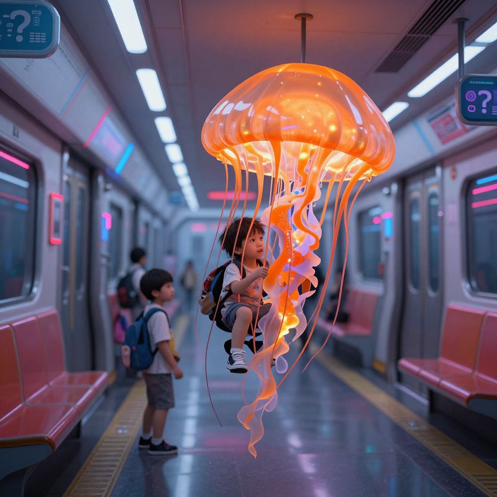 A surreal digital artwork depicts children riding a giant, glowing orange jellyfish through a futuristic, neon-lit subway system, where the platforms shimmer faintly as if questioning their own existence, blending cyberpunk aesthetics with imaginative visual effects.