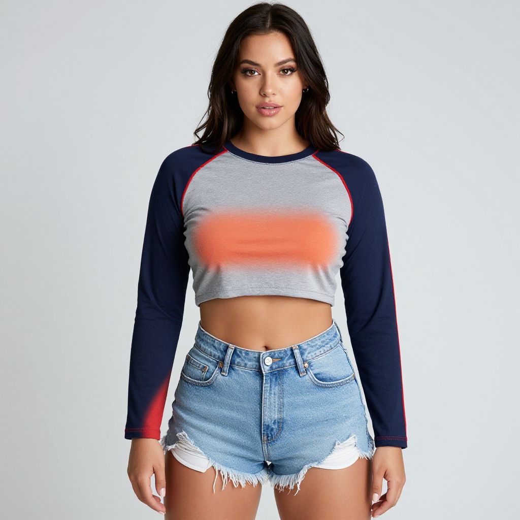 "Woman, sporty streetwear, cropped long sleeve top in color block design with shades of dark blue, grey, and orange, raglan sleeves with red piping detail, high-waisted denim shorts with frayed hem, light blue wash, studio background with a plain light backdrop.. Sexy. Pretty face and beаutiful eyes. Big breasts."