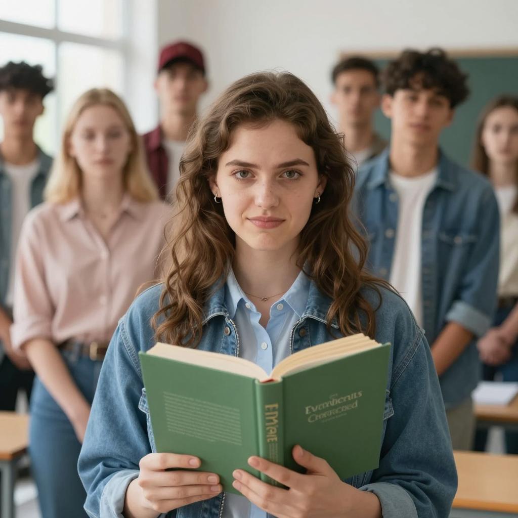 Woman with wavy brown hair, wearing a blue jacket and light blue shirt, holding a green book in front of her. Background: group of people standing in a classroom, including a man in a red cap, woman with blonde hair in a pink shirt, and others in casual clothes. Light coming through windows. Woman's expression is slightly smug. 7 people in background.