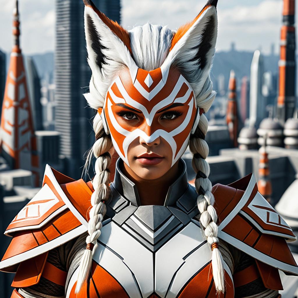 Digital artwork of a female warrior wearing an Ahsoka Tano inspired outfit featuring fox ears and white braided hair. The character has orange and white tribal face markings, stylized armored shoulders with intricate patterns, and a confident expression. The background shows a blurred futuristic cityscape under daylight. The image combines realistic CGI style with anime influence, presenting symmetrical face paint and detailed armor design.