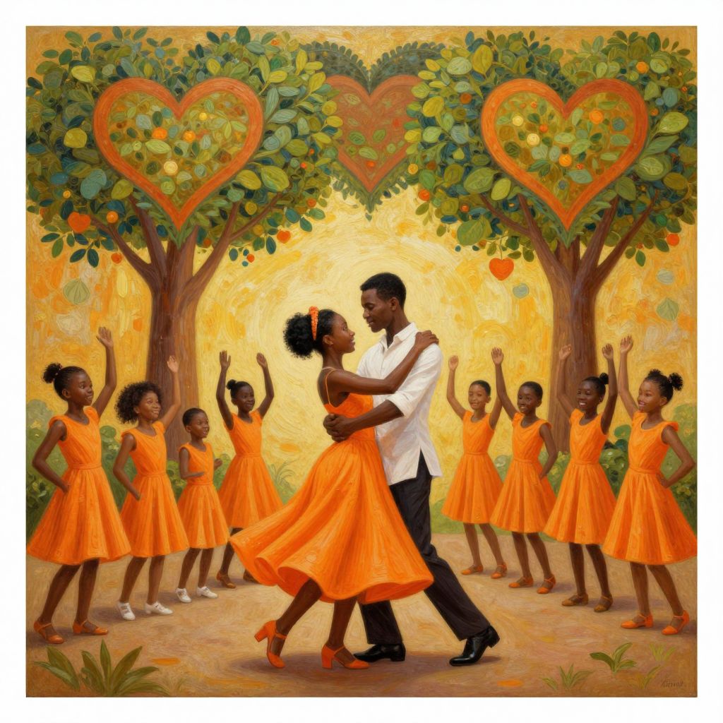 Painted digital artwork of a Black couple dancing in the center, surrounded by seven girls in orange dresses, under orange heart-shaped trees. Warm, vibrant