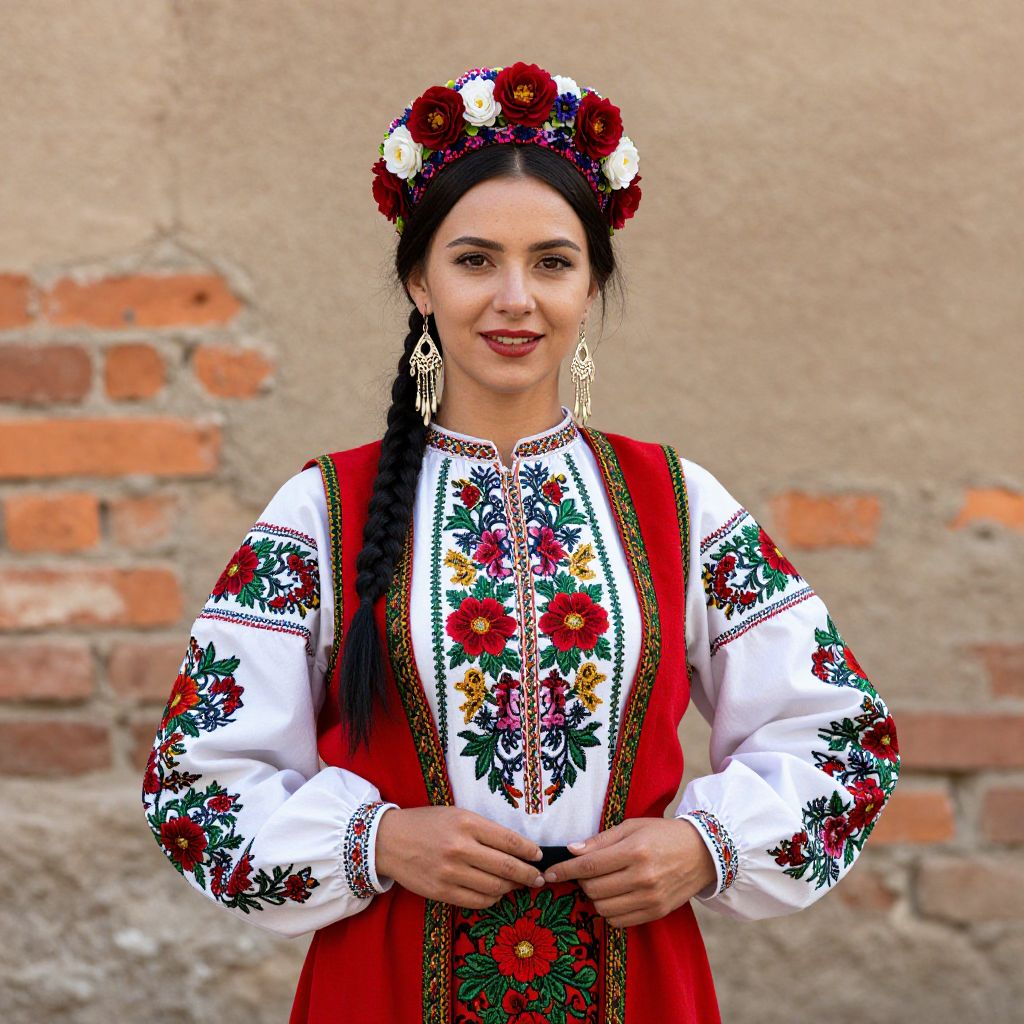 Woman wearing a vibrant Bulgarian national costume, featuring intricate floral embroidery, bold red accents, and traditional accessories including a floral headpiece and dangling earrings, stands gracefully against a rustic brick background.