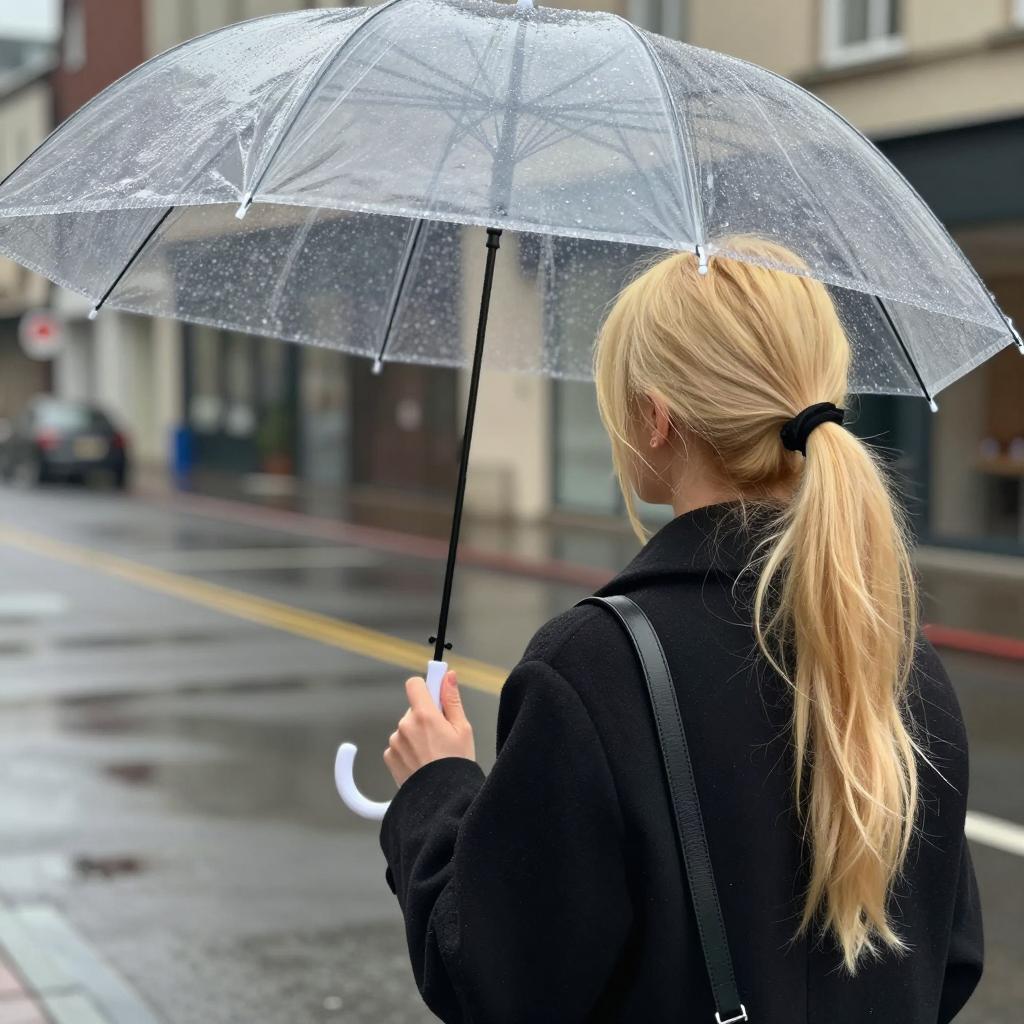 Woman with long blonde hair in a black ponytail, wearing a black coat, holding a transparent umbrella. Raindrops on umbrella. Urban street in background with wet pavement and buildings. Over-the-shoulder view. Black strap on coat. White umbrella handle. Daylight.