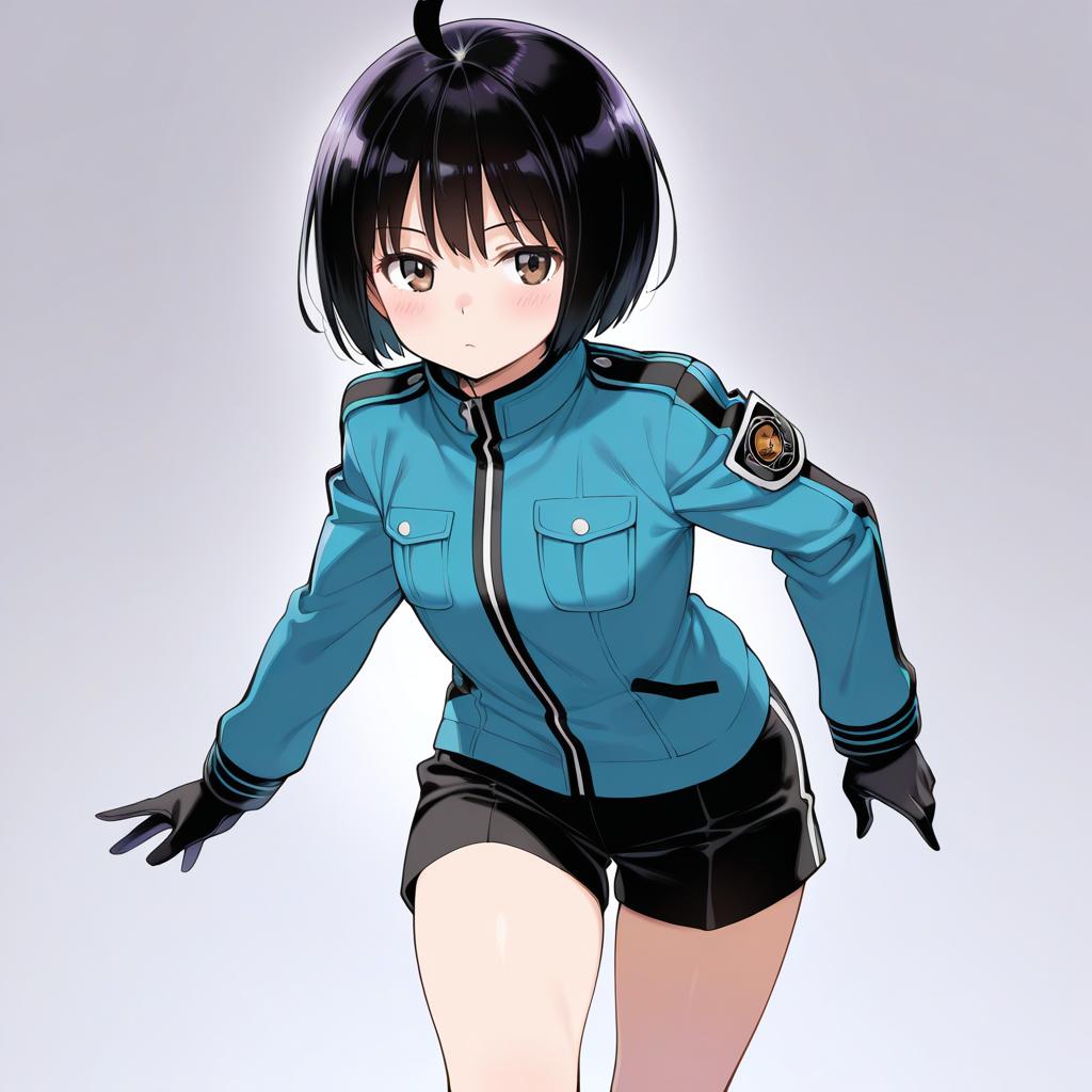 Amatori chika, world trigger, 1girl, purple eyes, short hair, black hair, ahoge, bob cut, mikumo squad's uniform, uniform, mikumo squad's uniform, black gloves, uniform, black shorts, blue jacket, long sleeves, by artist nora higuma, illustrious