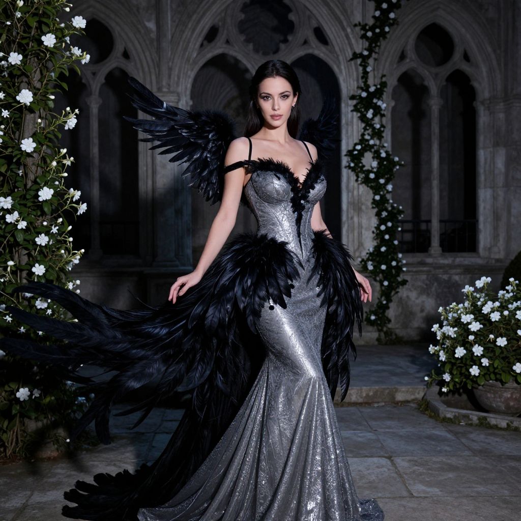 Photograph of a fair-skinned woman with dark brown hair, wearing a silver, shimmering, mermaid-style evening gown adorned with black feathered wings on the shoulders and hips. She stands in a Gothic-style stone archway, surrounded by white flowers and dark green vines. The gown's texture is sequined, reflecting light, while her wings add a dramatic, angelic element. Her expression is poised, and she gazes directly at the camera, exuding elegance and mystery. The background is dimly lit, highlighting her luminous dress and black feathered wings.