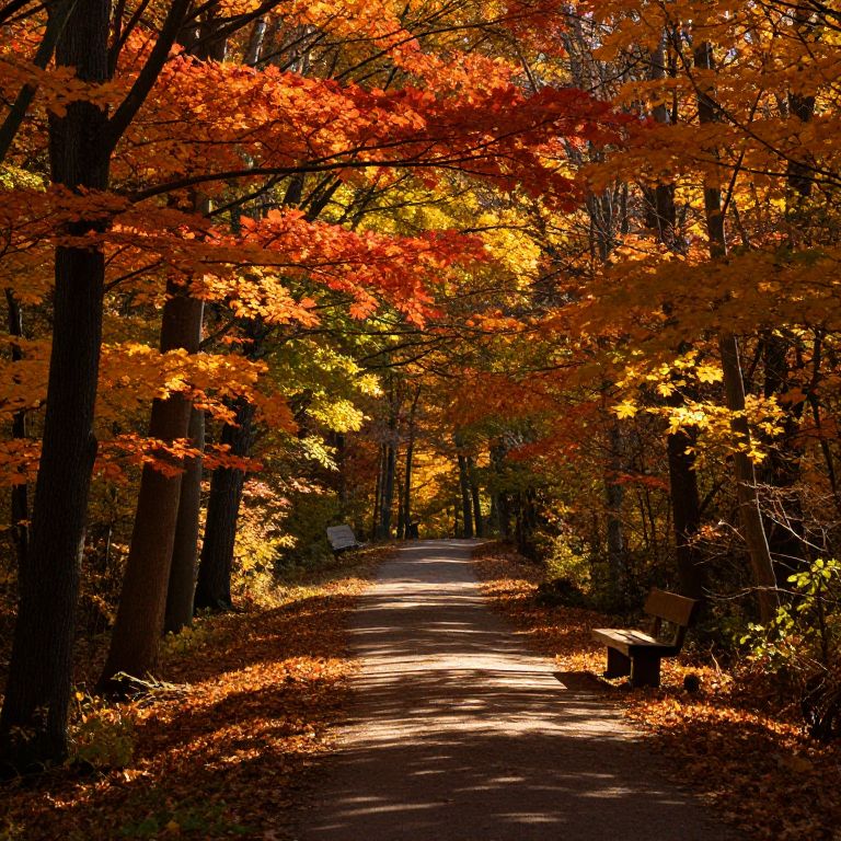 Photograph of a sun-dappled forest path lined with tall trees in autumn. The vibrant leaves are a mix of fiery reds, oranges, and yellows, creating a rich, colorful canopy. Sunlight filters through the leaves, casting dappled shadows on the path. The ground is covered with fallen leaves, and a wooden bench sits on the right side of the path. The scene evokes a peaceful, warm autumn day, with a sense of depth and natural beauty. The path stretches into the distance, inviting exploration.