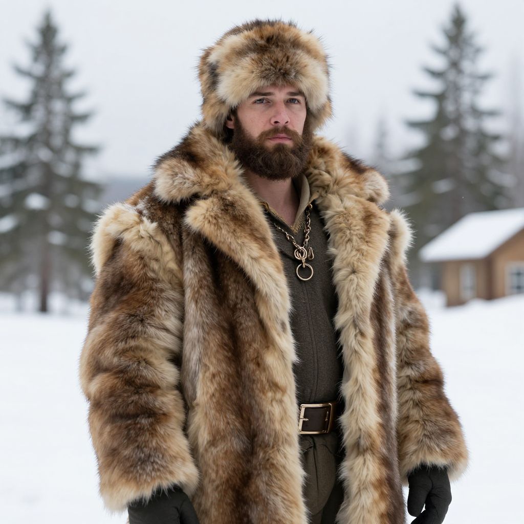 Photograph of a bearded man with fair skin standing in a snowy landscape. He is wearing a large, luxurious brown and beige fur coat with a fur-lined hood, over a dark brown, ribbed sweater. A thick silver chain necklace hangs around his neck. He has dark gloves on his hands, and his expression is serious. The background features snow-covered trees and a wooden house, slightly out of focus, adding depth to the winter setting. The overall color palette includes whites, browns, and beiges, with the fur coat's texture being prominent.