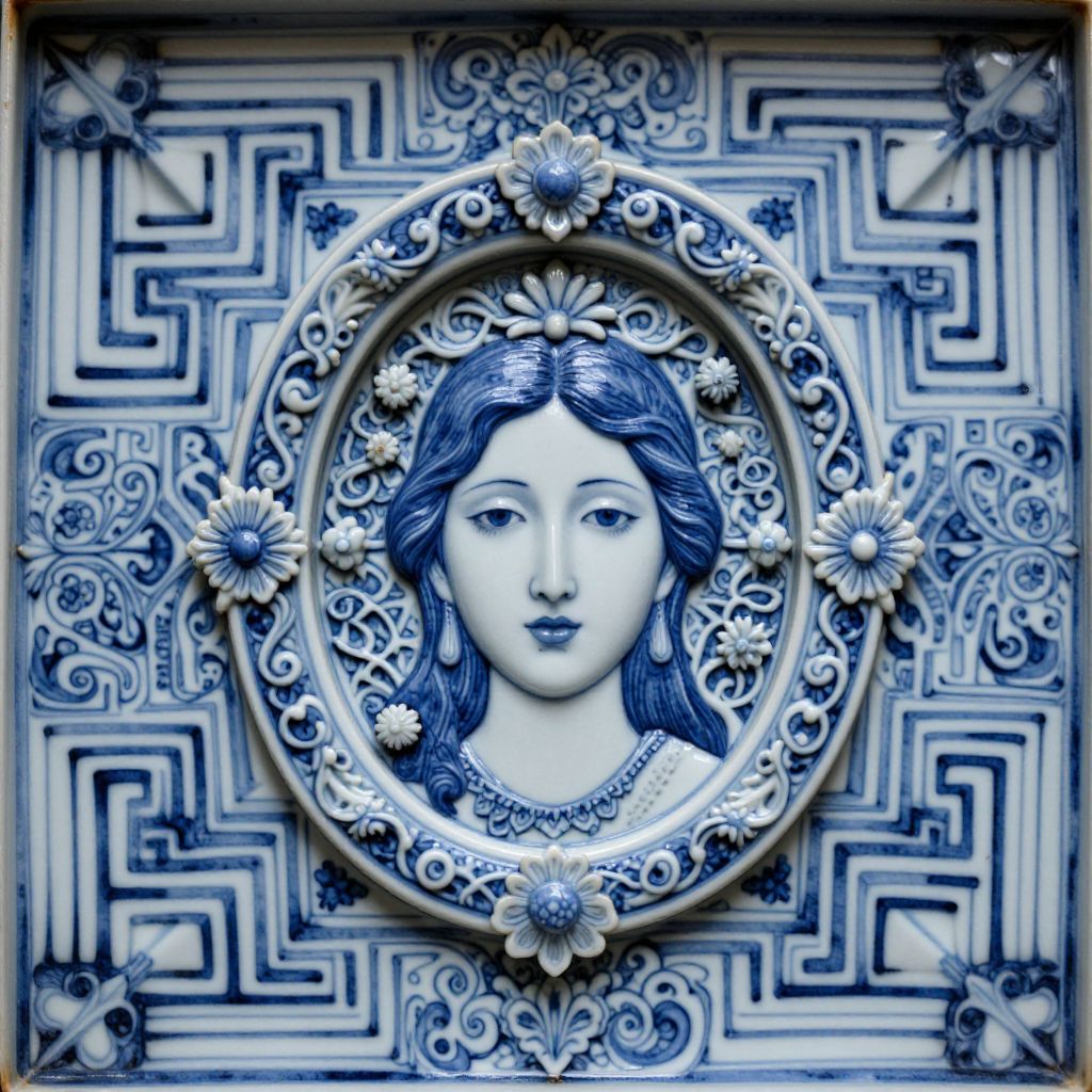 Photograph of an intricate blue and white ceramic plaque featuring a serene, detailed portrait of an Asian woman with long hair, framed by floral patterns and geometric