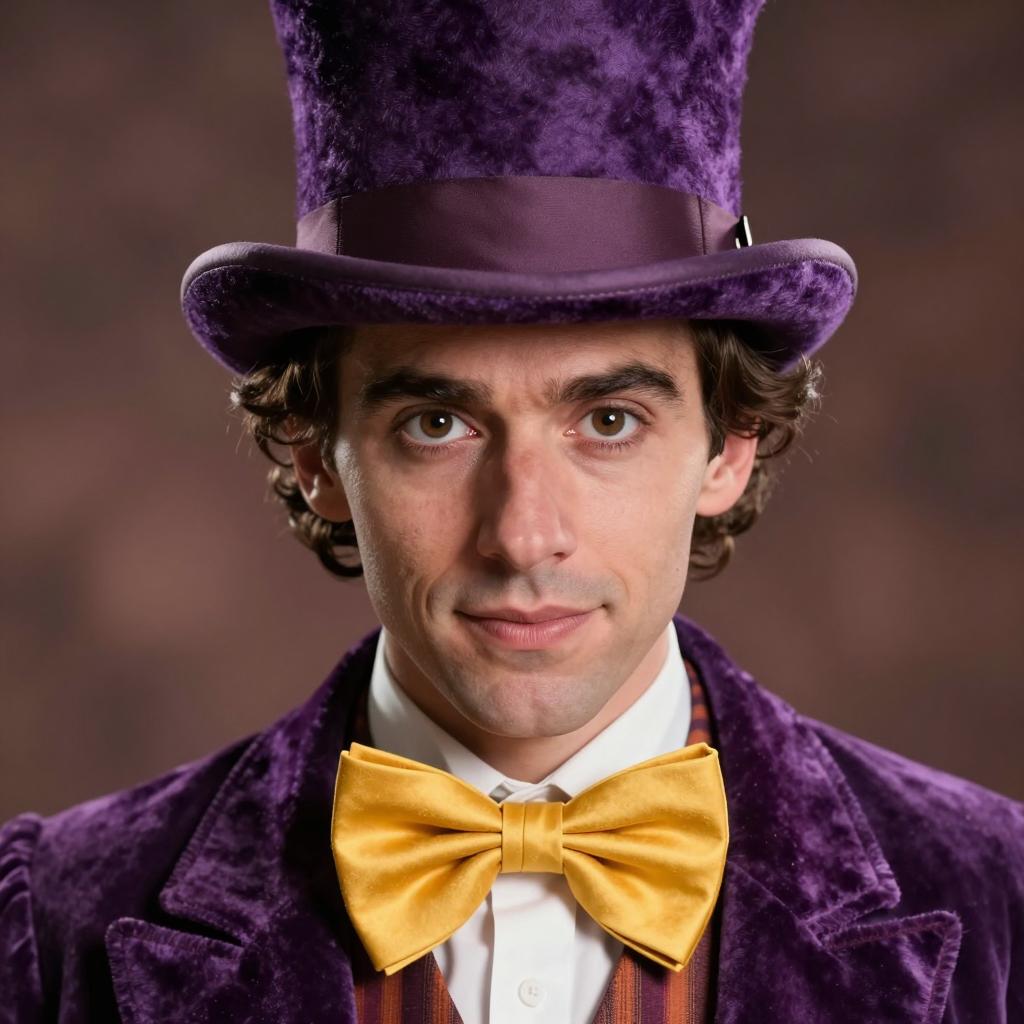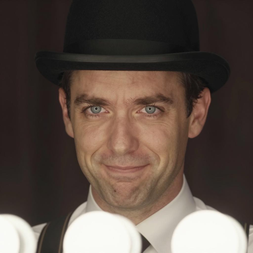 Close-up photograph of a white man with blue eyes, wearing a black bowler hat and white shirt with suspenders. He has a slight smirk, with visible eyelashes and slightly furrowed eyebrows. Bright white circular lights are in the foreground. Dark background. One person, facing forward, with head slightly tilted to the right.