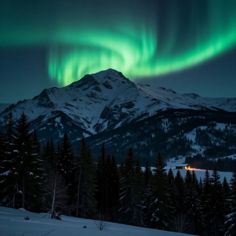 Nacht mountain landscape with a glowing aurora borealis above rugged peaks, dark pine forests below covered partially in snow, a lone cabin with warm lights in the distance, blending dramatic natural phenomena with peaceful solitude and rich detail.