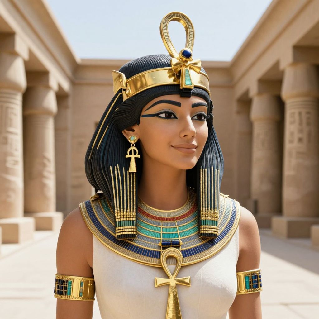 Digital art of an Egyptian woman with dark blue hair, gold headpiece, white dress, colorful necklace, and Ankh earrings, standing in a sun