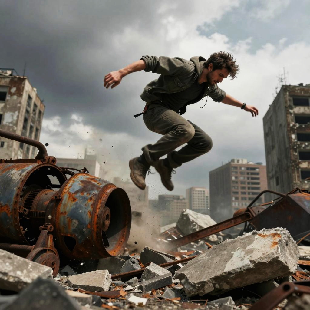 Dynamic action scene featuring kym leaping over rubble in a post-apocalyptic urban setting, dramatic cloudy sky, gritty and textured environment with rusted machinery and broken concrete, intense motion blur and powerful composition