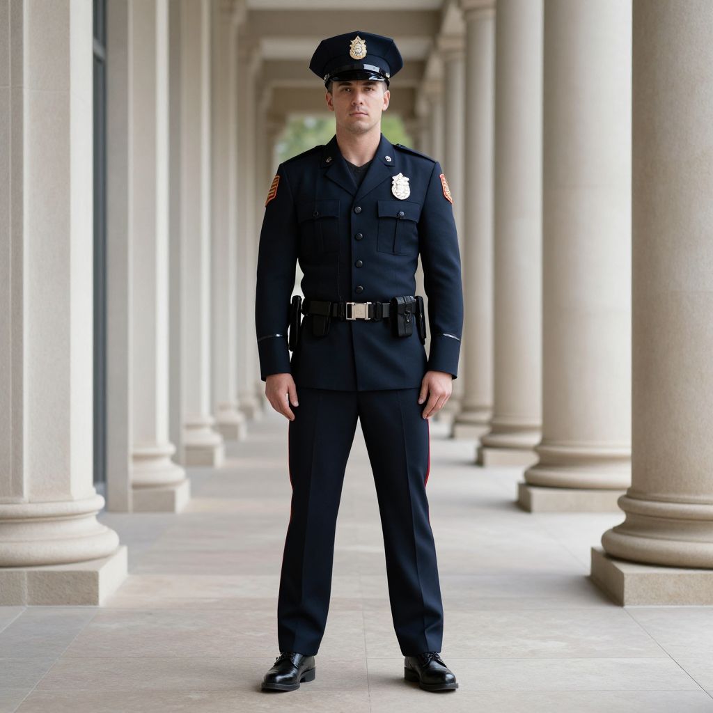 Photograph of a young, Caucasian male police officer standing in a colonnaded hallway. He has short, dark hair, and is wearing a dark blue uniform with a badge on the chest, a police hat with a silver badge, black belt with equipment, and black shoes. The uniform features a patch on the left sleeve. The background consists of tall, white marble columns and a light-colored tiled floor. The officer's expression is neutral, and he stands with his hands by his sides, centered in the image. The lighting is natural, highlighting the symmetry of the columns.