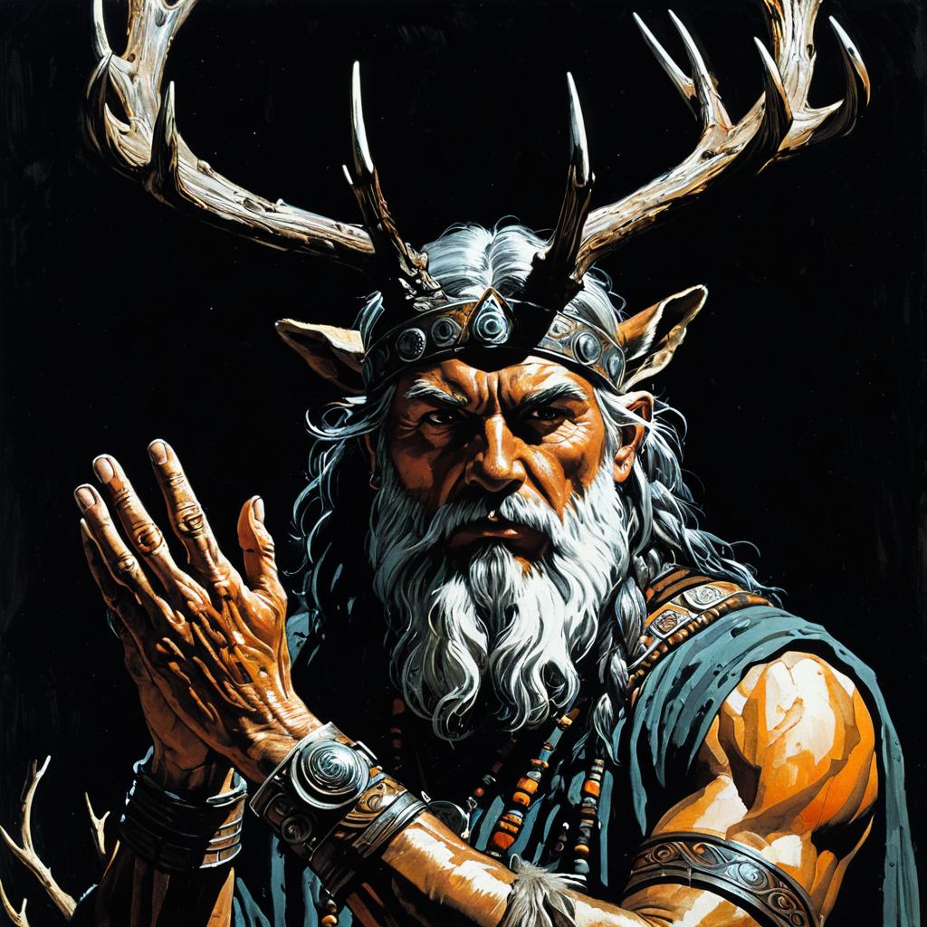 Male ancient forest druid in a close-up portrait, featuring weathered bark-like skin and piercing amber eyes. He has branches growing from his scalp and holds a vast stag elk in his hands, set against a black background with studio lighting to highlight his features. Rendered in a retro color palette, the artwork is highly detailed, blending science fiction and fantasy elements. Influenced by Frank Frazetta, Syd Mead, and Norman Rockwell, the painting captures a mystical, otherworldly essence with a touch of classic artistry.