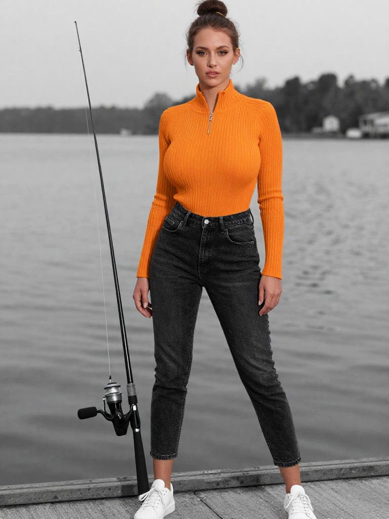 A lean woman in a bright orange ribbed mock neck sweater with half-zipper, tucked into high-waisted dark denim jeans, and white lace-up sneakers, stands at a fishing pier with fishing rods. Visual style: Ilford film stock. Sexy. Pretty face and beаutiful eyes. Big breasts