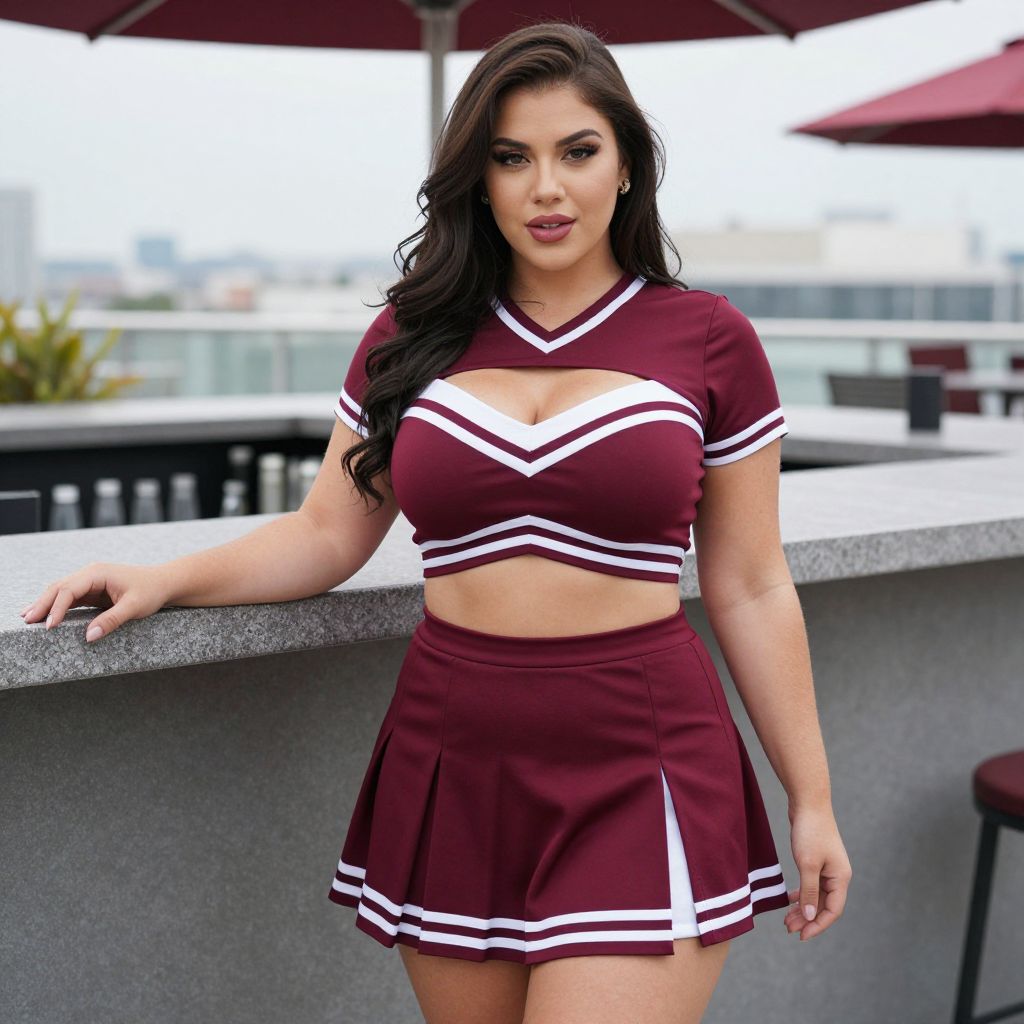 A Curvy woman, sporty chic in a burgundy cheerleader-inspired two-piece set with a cropped top and matching pleated miniskirt, exuding a vibrant energy at a Rooftop with bar counter, captured in the visual style of hakusensha. Sexy. Pretty face and beutiful eyes Sexy. Pretty face and beаutiful eyes. Big breasts