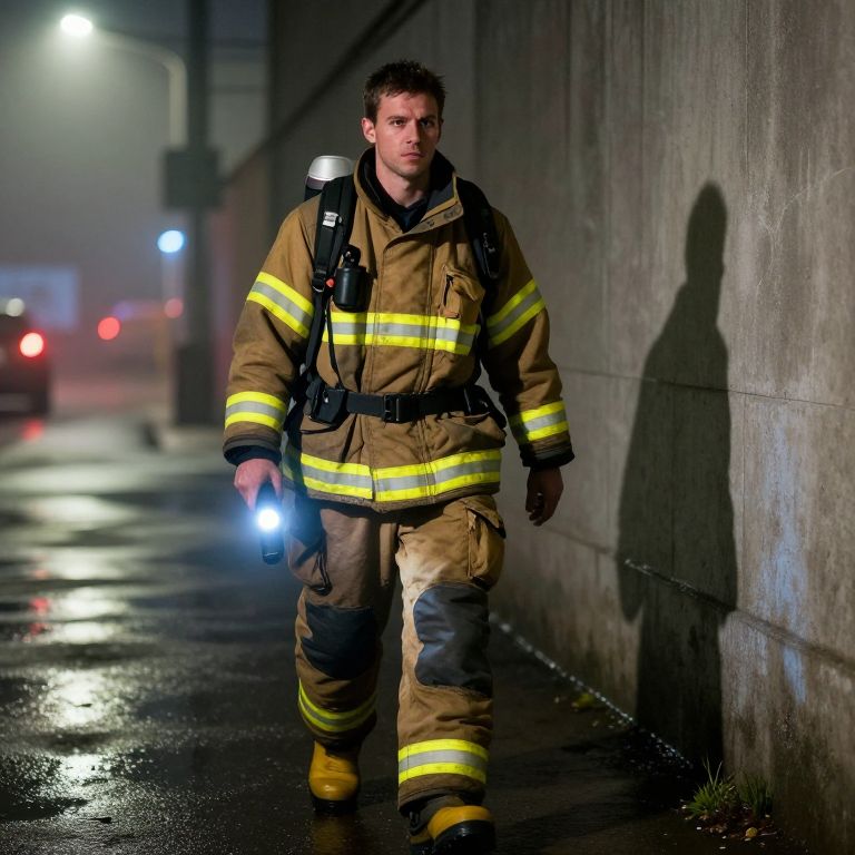 Photograph of a serious male firefighter in tan gear with yellow stripes, holding a flashlight, walking on a wet, dimly-lit alley at night