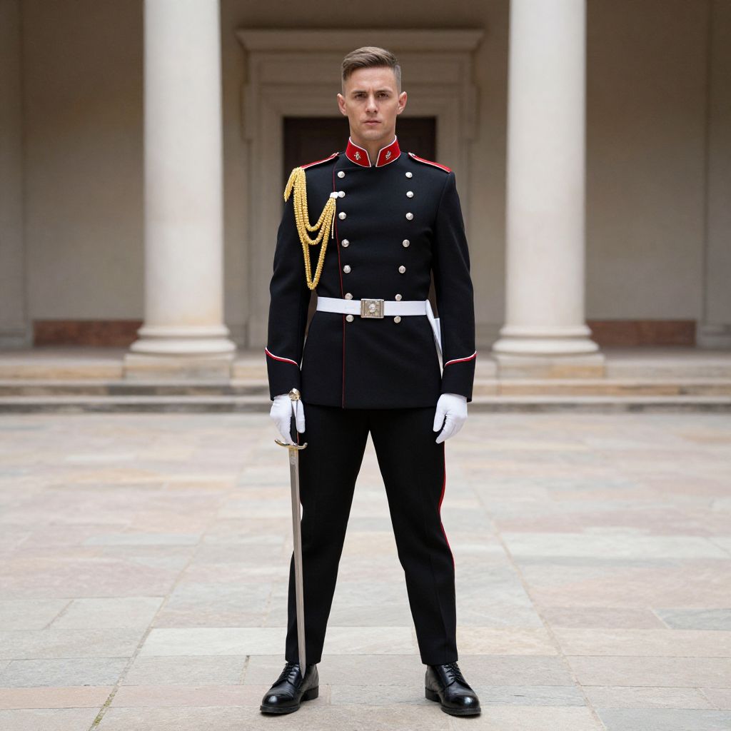 Rockettes Soldier Costume, soldier in uniform standing in a courtyard with a sword
