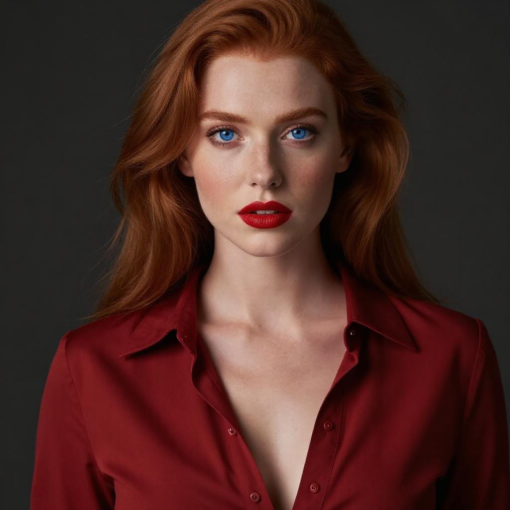 A striking portrait of a woman with long red hair and vivid blue eyes, wearing a deep red button-up shirt partially unbuttoned to reveal cleavage. The image features a realistic photographic style with dramatic lighting that enhances her flawless skin and bold red lipstick, set against a dark background.