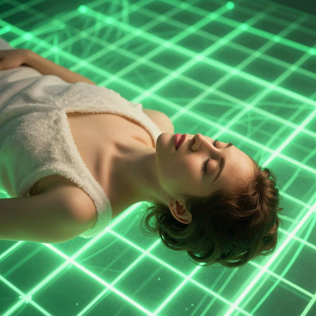 A stunning digital artwork merging photorealism with abstract digital effects, showcasing a serene woman with closed eyes lying on her back, her face gently illuminated by warm light that highlights her delicate features and casts soft shadows, She has light skin and dark, neatly styled hair that frames her tranquil expression, exuding peace and introspection, The woman is draped in white, soft, fluffy clothing, adding an element of comfort and purity to the composition, subtly contrasting with the futuristic elements around her, The background features a bright, glowing green grid pattern, its luminous lines intersecting precisely to form a vivid, network-like structure, The vibrant, ethereal glow of the grid creates a stark contrast against her warm skin tones and the soft texture of her clothing, intensifying the interplay of light and shadow, This radiant grid design adds depth and dimension, giving the impression that she is floating or suspended within a surreal, digital space, Blending surrealism and digital artistry, the piece evokes a dreamlike atmosphere that bridges the physical and the abstract, Her serene presence and the intricate, glowing grid explore themes of consciousness, reality, and digital existence, resulting in a captivating, otherworldly visual experience