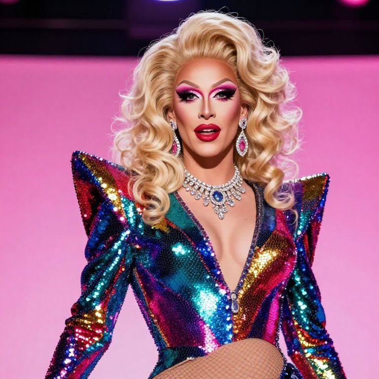 Muscular drag queens posing confidently on a vibrant neon-lit stage, extravagant colorful costumes with glitter and feathers, dramatic makeup, bold and fierce expressions, high energy