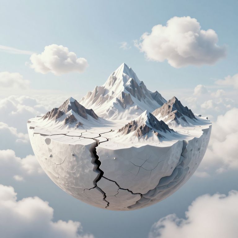 Photorealistic digital art of a cracked, white, spherical mountain with jagged peaks floating in a bright blue sky with fluffy clouds.