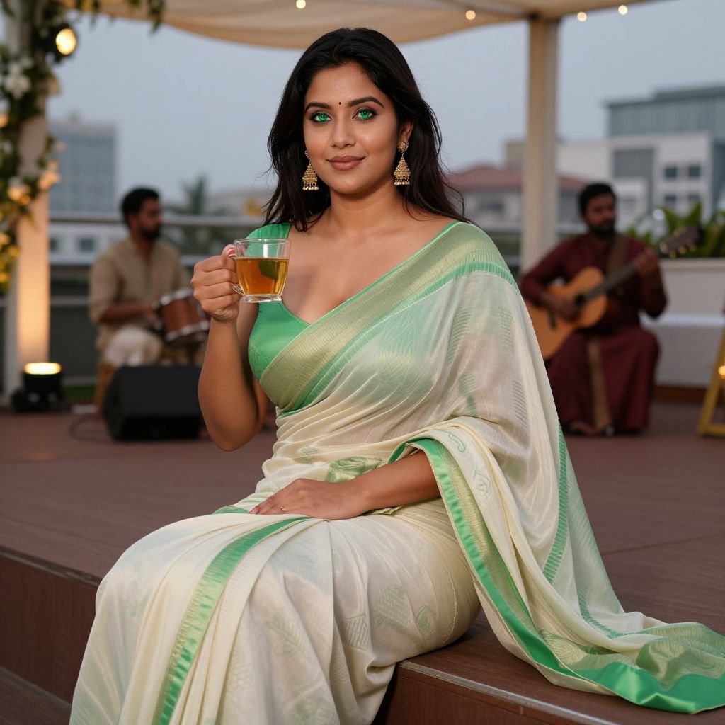 A modern-style wedding saree woman in her early 30s with bright green eyes and a soft brown complexion, wearing a sleek, contemporary green and cream saree with subtle geometric patterns, seated at a rooftop wedding celebration in Mumbai with traditional music and ambient lighting, the saree gently flowing as she holds a cup of tea with a relaxed, joyful expression.. The woman has big tits and cute face