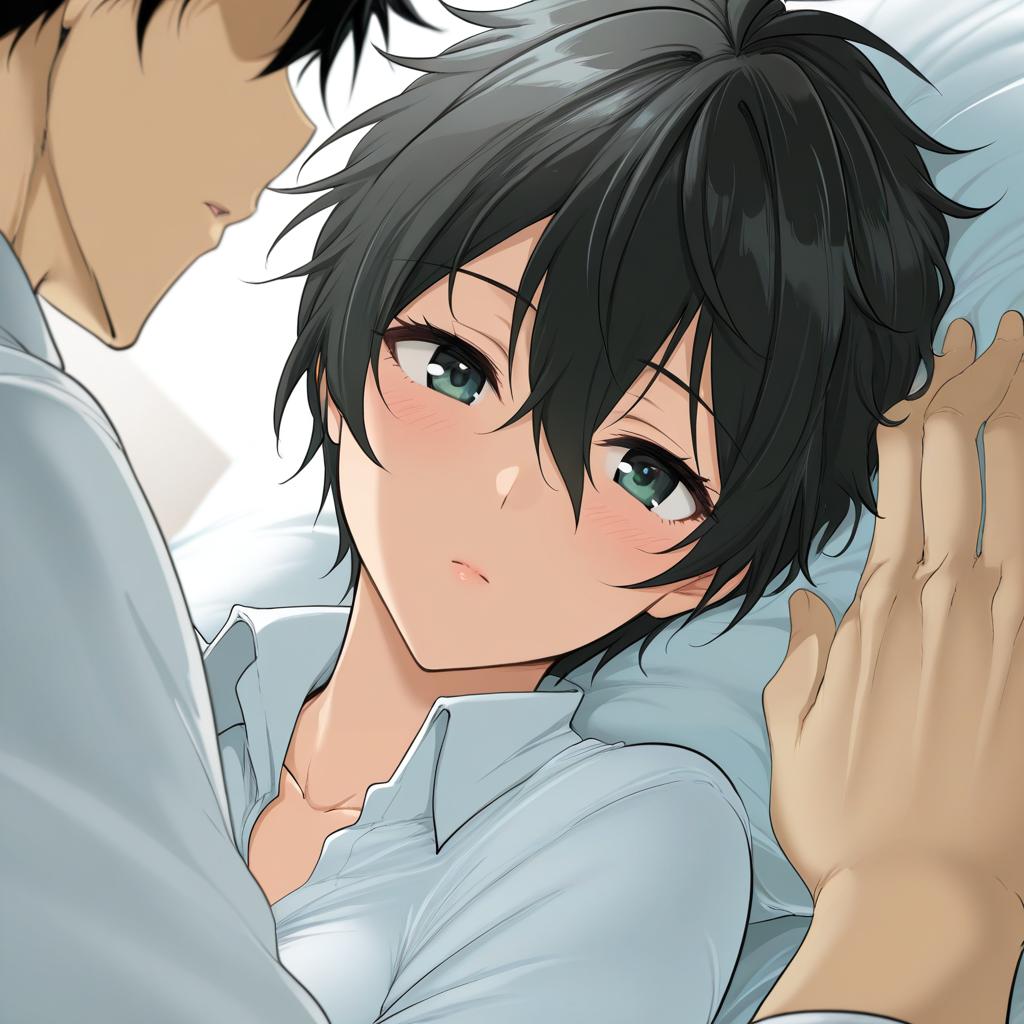 This digital anime-style illustration depicts a close-up of a young man with short, messy black hair and large, blue-green eyes, looking slightly upward with a shy, blushing expression. He wears a light blue, slightly unbuttoned shirt. A man's hands, with fair skin and visible veins, gently hold his head from the sides. The background is a simple white with soft blue lines, emphasizing the characters. The young man's expression and the intimate positioning of the hands suggest a tender, possibly romantic moment. The art style features sharp lines, soft shading, and a focus on emotional expression.