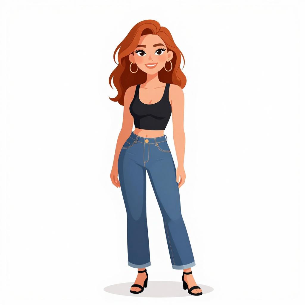 Illustration of a smiling young woman with red hair, wearing a black sleeveless crop top with scoop neckline, high-waisted medium wash straight-leg jeans, and black strappy sandals. She has minimal jewelry including hoop earrings and natural makeup, standing against a white studio background.