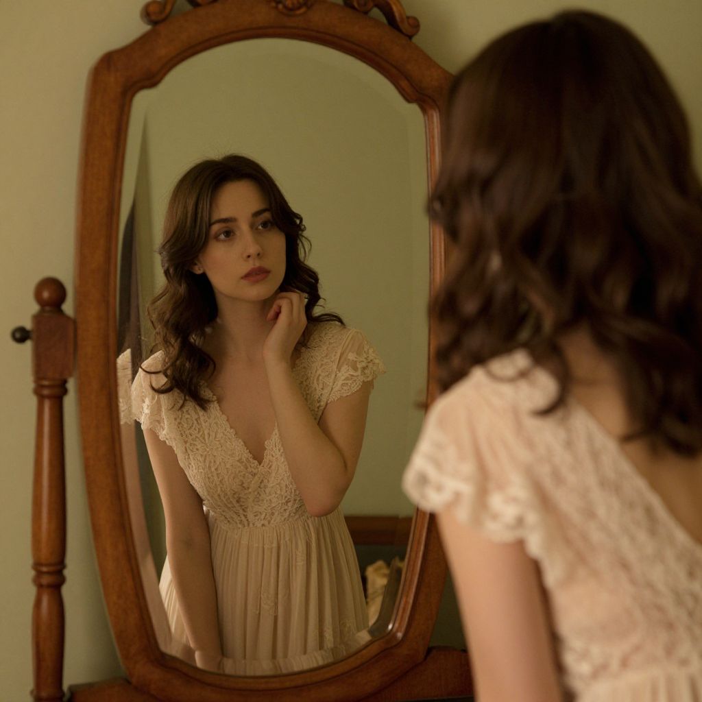 In a softly lit room with vintage charm, a woman in a delicate lace dress stands before a classic wooden mirror, her reflection capturing a poignant moment of introspection, where the mirror's surface subtly hints at forgotten memories through its timeless, high-definition realism.