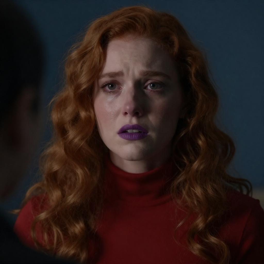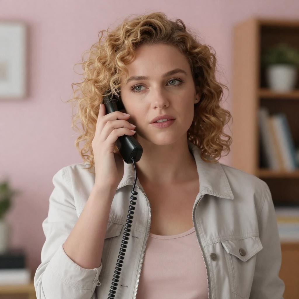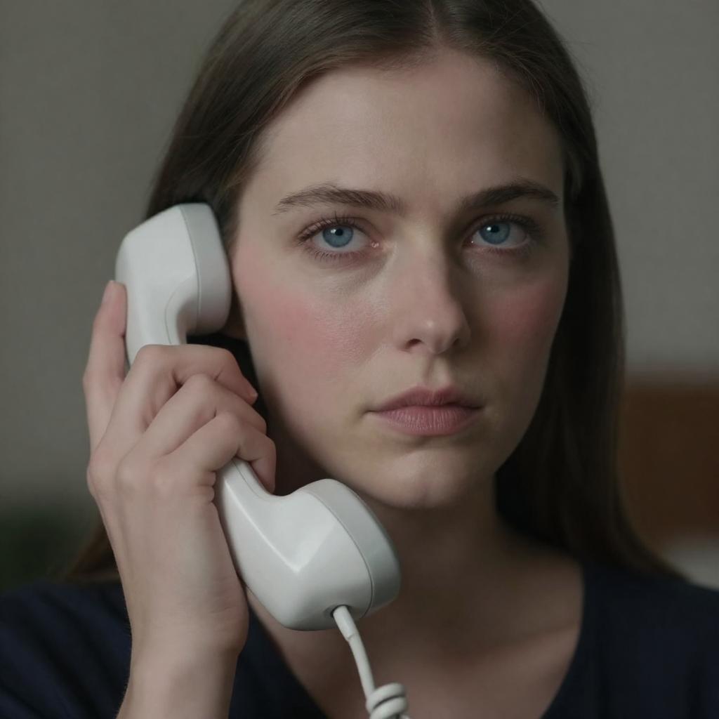 Photograph of a woman with long, voluminous red hair, holding a black corded phone to her ear. She has intense brown eyes and is wearing a silver ring on her left hand. Her expression is focused. Background is blurred.
