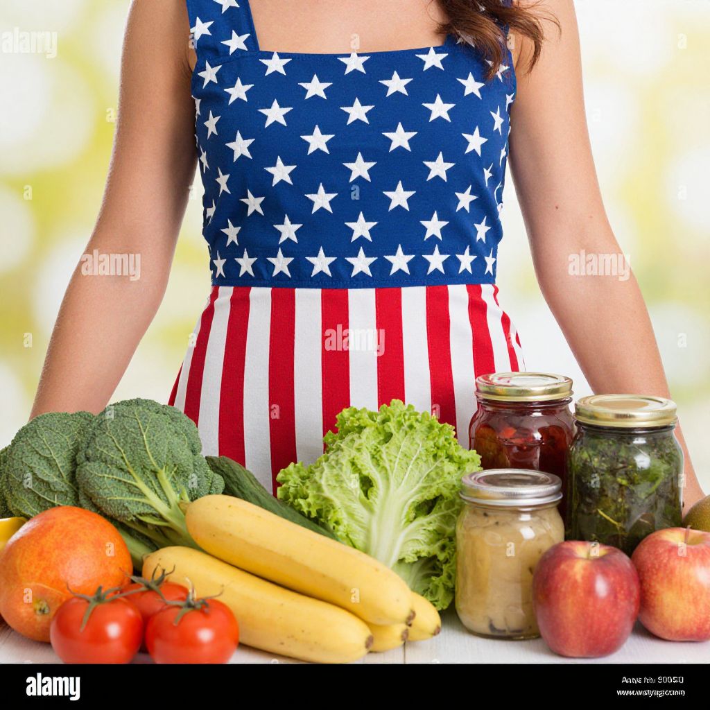 The fruits of victory. Woman dressed in stars and stripes with vegetables and jars of preserved food. - Stock Image