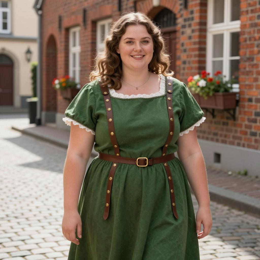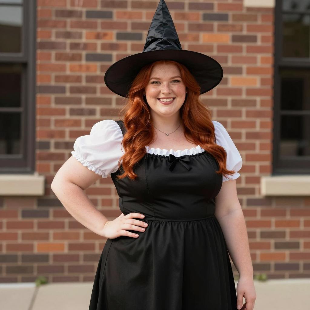 Plus size woman little red, photograph of a plus-sized woman, long dark curly hair, wearing a red dress with white lace cuffs, red headband, white knee-high socks, standing in a brick archway, green trees in background, daytime, soft light, slightly blurred background, centered, confident expression, full body shot, casual, natural setting, realistic, vibrant colors