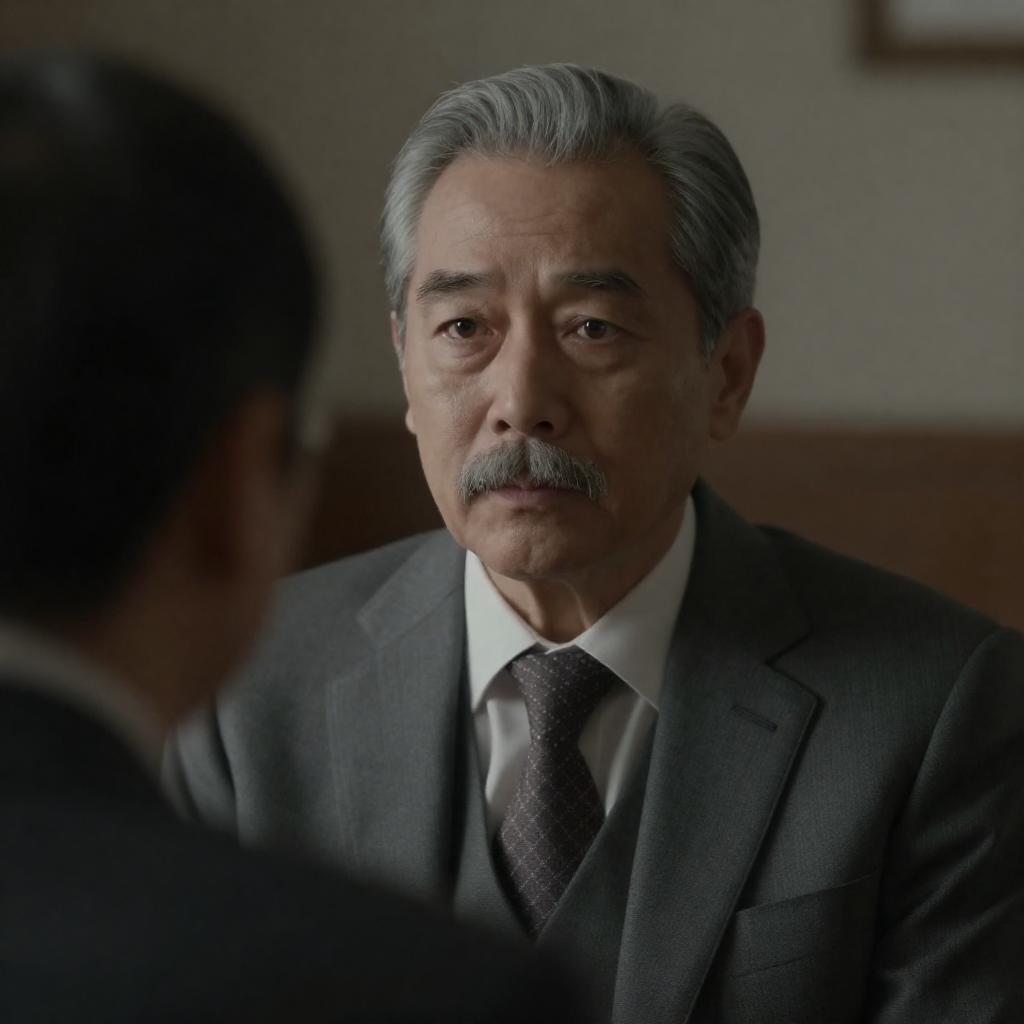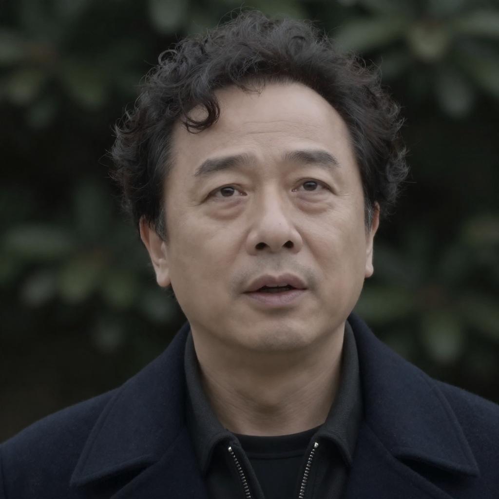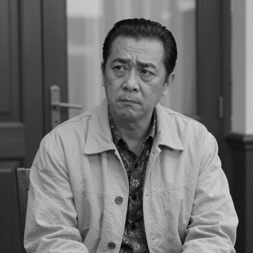 Middle-aged Asian man with short black hair and beard, wearing a green cap and red jacket, looking slightly to the side. Dimly lit background with a window. Serious expression. Centered in frame.