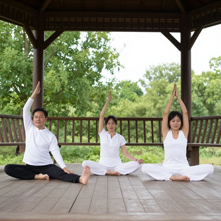 Photograph of an Asian man and woman in white yoga outfits, sitting cross-legged under a wooden pavilion, raising arms in a yoga pose, with